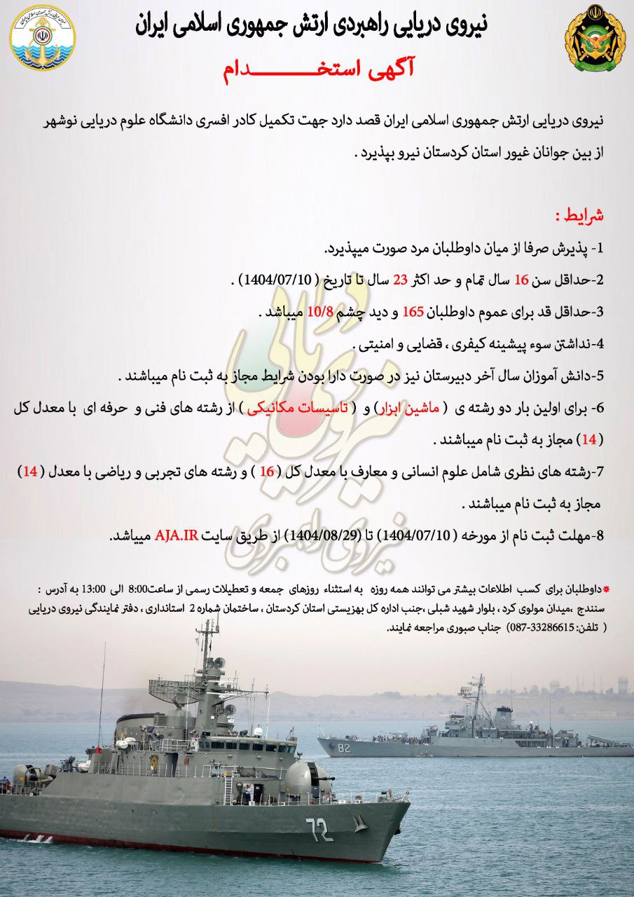 یروی دریایی قصد داره به لطف امیر ایرانی فرمانده نیروی دریایی که خودشونم سنندجین از بین جوانان اهل کردستان برای دانشکده افسری نیرو جذب کنند . بروشور مطالعه شود .رئیس گزینش نیروی دریایی